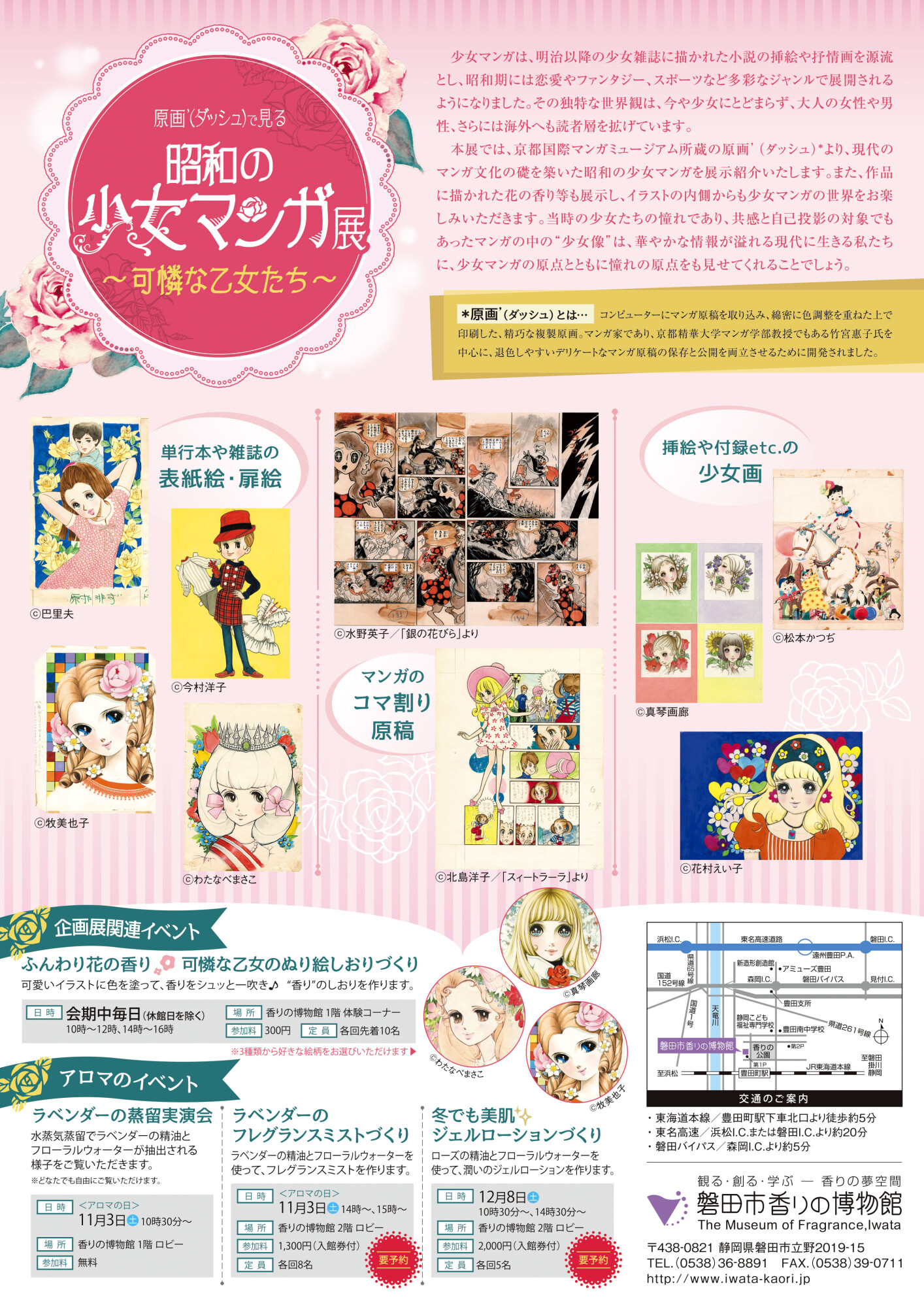 本展では、京都国際マンガミュージアム所蔵の原画’(ダッシュ)*より、現代のマンガ文化の礎を築いた昭和の少女マンガを展示紹介いたします。また、作品に描かれた花の香り等も展示し、イラストの内側からも少女マンガの世界をお楽しみいただきます。当時の少女たちの憧れであり、共感と自己投影の対象でもあったマンガの中の“少女像”は、華やかな情報が溢れる現代に生きる私たちに、少女マンガの原点とともに憧れの原点をも見せてくれることでしょう。